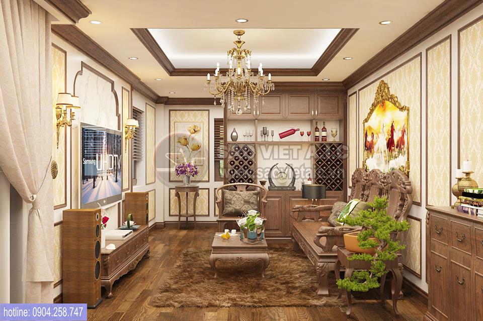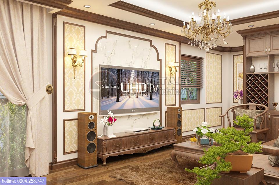 Nội thất phòng khách được thiết kế theo phong cách nội thất tân cổ điển Châu Âu luôn lấy tone màu nâu trầm làm chủ đạo. Không cầu kỳ, rườm rà và xa hoa như phong cách cổ điển, tân cổ điển chỉ nhẹ nhàng ghi dấu ấn bằng những mặt phẳng của trần, tường và những đường cong tinh tế trên các món đồ nội thất.
