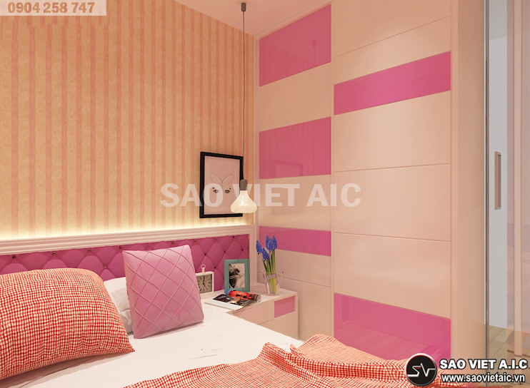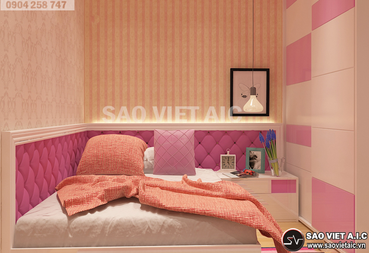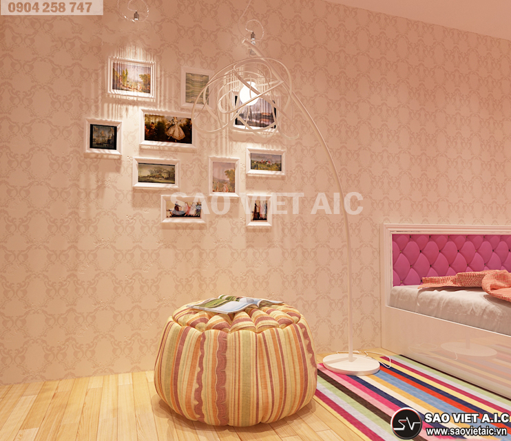 Phòng ngủ con gái được thiết kế tông màu hồng làm chủ đạo tạo nên không gian sống mộng mơ cho con gái