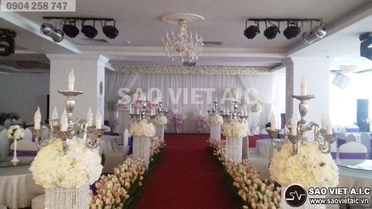 Thiết kế sân khấu tiệc cưới được trang trí  bông hoa trắng  ở 2 bên  lối đi tạo được ấn tượng cho những người đến dự tiệc cưới