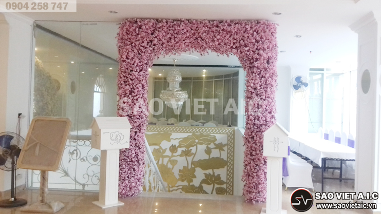 Lối nên tầng 2 của nhà hàng được trang trí một cổng cưới với những bông hoa màu hồng lãng mạng