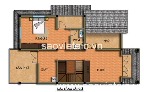 Tầng 3: 1 p.thờ, 1 p.ngủ, 1 wc, 1 kho, 1 p.giặt, 1 sân phơi