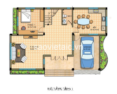 Tầng 1: 1 p.khách, 1 garage, 1 p.ngủ, 1 bếp+giặt
