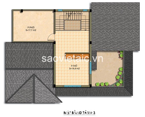 Tầng 3: 1 p.thờ, 3 p.ngủ, 2 wc